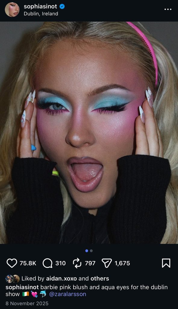 Recently seen from tour images and social media posts, Larsson has leaned into vivid colour, shimmer and playful detailing. Moving away from the trend that dominated beauty ideas, minimal ’clean girl’ makeup, Larsson’s longtime makeup artist Sophia Sinot has been credited for shaping her new look. Blossoming colours and glitter everywhere but perfectly executed. Her Midnight Sun tour saw a paid partnership with Maybelline NY which caused circulations online and increased inspired recreations across TikTok and Instagram.